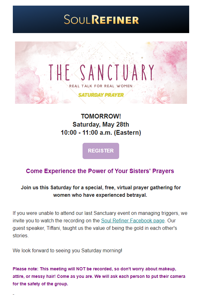 Come Experience the Power of Your Sisters’ Prayers May 27, 2022 by Admin 0 Comments0 Comments Greetings Lighthouse Inc., Church Family, Please see this announcement below and feel free to participate. click on photo to sign up. In Christ, Pastor/Evangelist Barbara Lynch