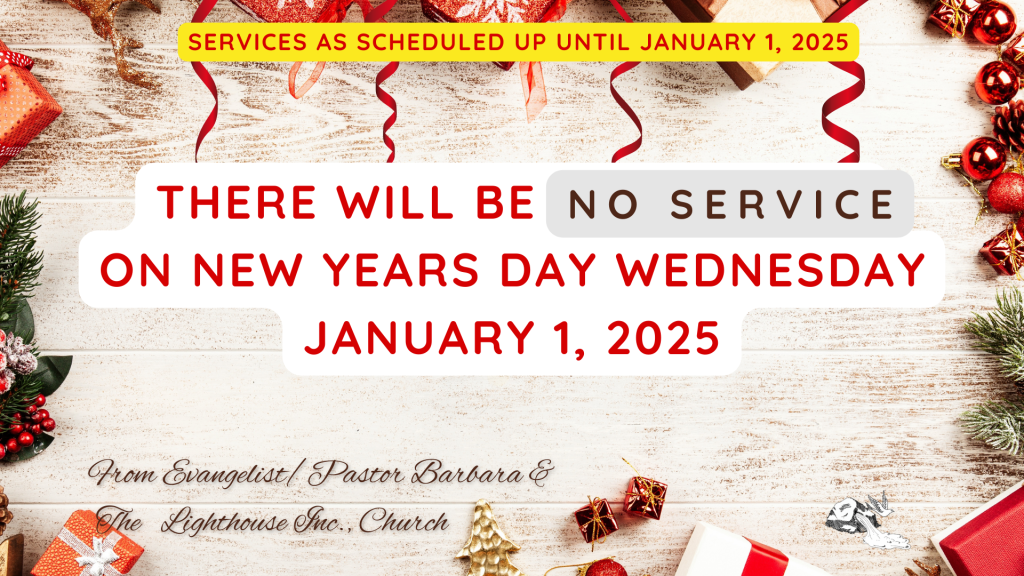No Service Wednesday January 1, 2025 December 30, 2024 by Admin Greetings Lighthouse Inc., Church Family, There will be no service Wednesday January 1, 2025. Happy New Year! Services will resume on Sunday January 5, 2025. Blessings, Evangelist/Pastor Barbara