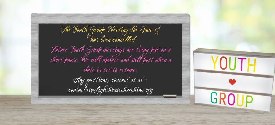 Youth Group Meeting – Friday June 13, 2025 Cancelled – Youth Group put on Pause March 23, 2025 by Admin The Youth Group Meeting is cancelled for Friday June 13, 2025. Future Youth Group meetings are being put on a short pause. We will update and will post when a date is set to resume. Any questions, contact us at: contactus@lighthousechurchinc.org